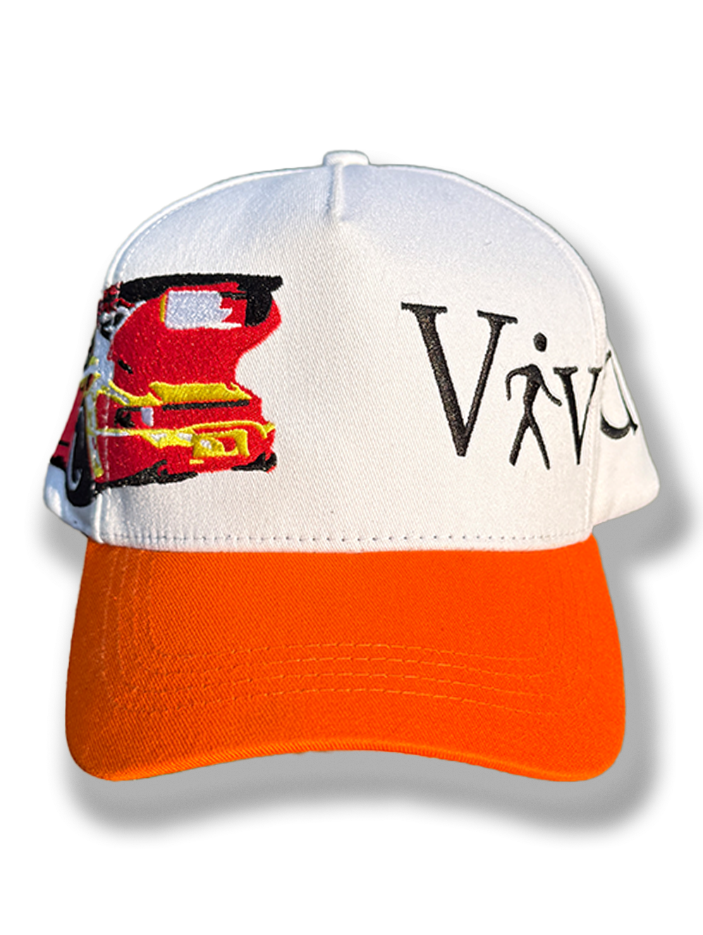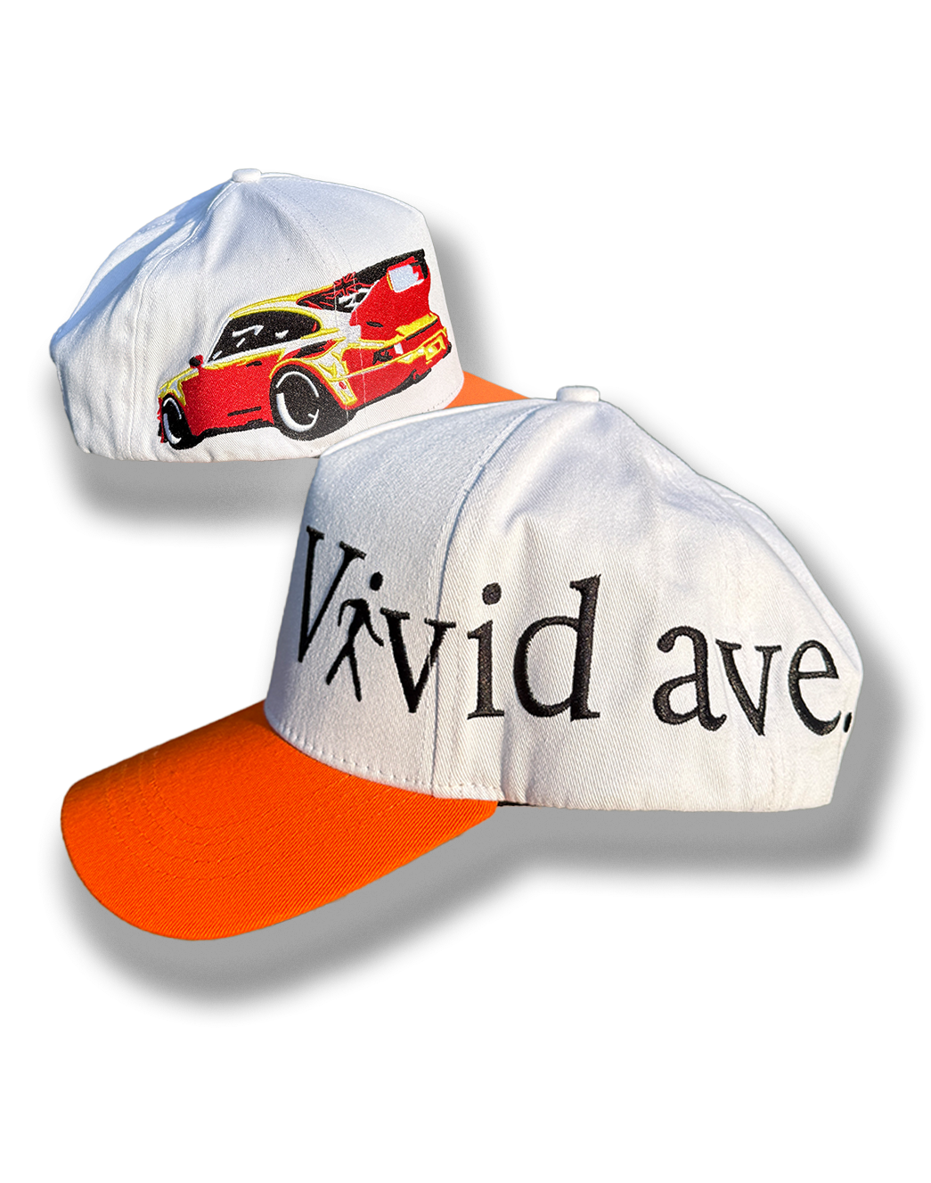 This embroidered statement piece from Vivid Ave. is made for the movers. Featuring a bold rear-angle tuner car in red and yellow threads, the design captures speed, heat, and drive. Along the side, “Vivid ave.” is stitched with a twist—the walk signal figure replaces the “i,” inspiring the name Walkman as a symbol of relentless motion and forward progress.