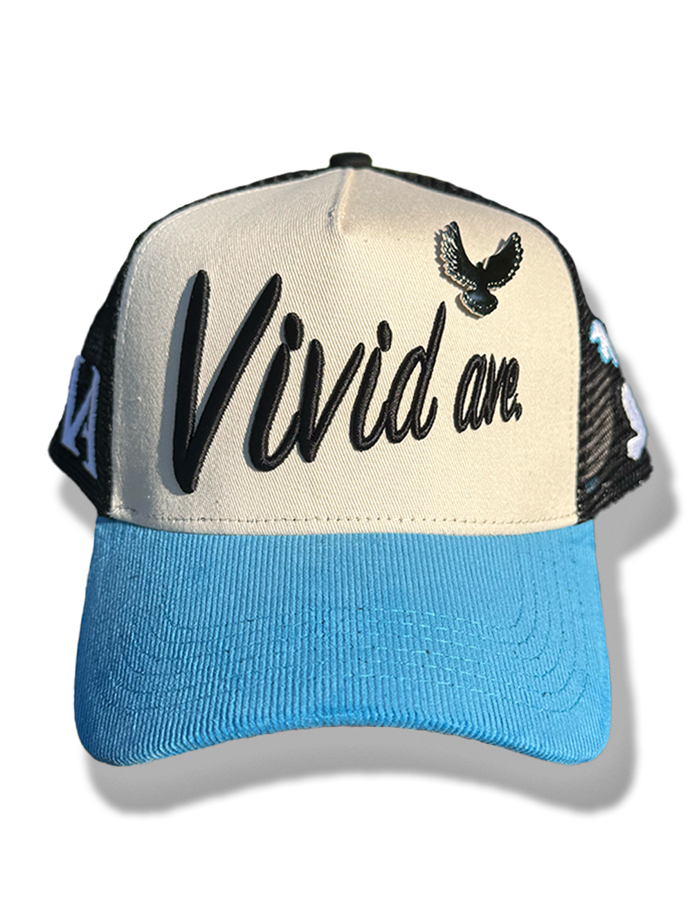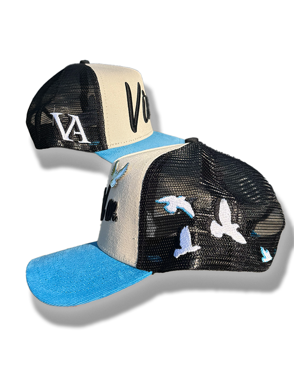 A sky blue corduroy brim anchors the design with bold contrast, while the black mesh sides and back feature embroidered white and blue doves in mid-flight—illustrating elevation, both in mindset and movement. The VA monogram on the side ties it all back to the brand’s roots in bold vision.